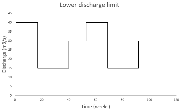 A state defined at a timestamp remains in effect until a new value is provided. After the final value in the dataset, the system remains in a constant state. Therefore, the only strict requirement is that the first data point occurs at, or before, the start of the data_period. While data can extend beyond the defined data period, such values are ignored by the model. Example of a break point series is shown below. Here a synthetic example of a minimum discharge limit for a hydropower station with 6 break points.